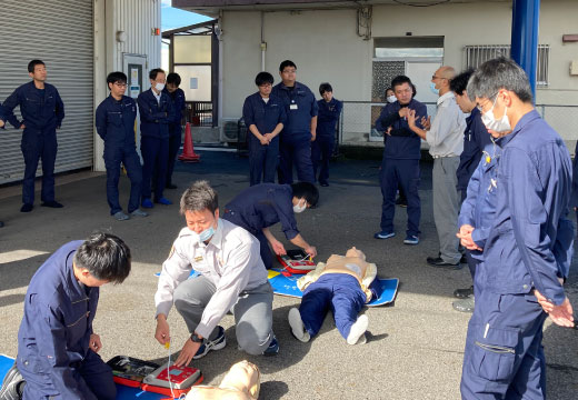 「もしもの時」に直面した際、慌てずに適切な対応を取り従業員の命を守れるように、応急手当ての基本からAEDの講習など、救急法の心得についての知識と技術を学ぶ安全教育を行っています。